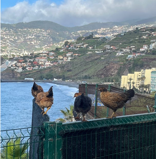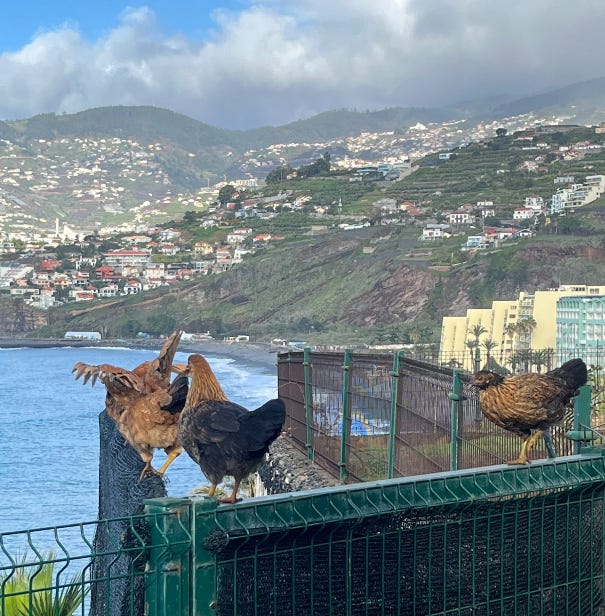 When we first arrived in Madeira, I spotted a rooster and hen in a touristy spot where people would stop and take pictures of the ocean in the background. One day, a few months ago, I saw nine baby chicks surrounding the mother hen and almost lost myself in excitement. I’ve always wanted to have chickens, but I’ve never had them, and watching these chickens was about as close as I imagined I’d get at this point in my life.